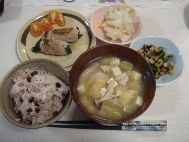 なすと大葉の豚肉巻き焼き、ミニトマト添え